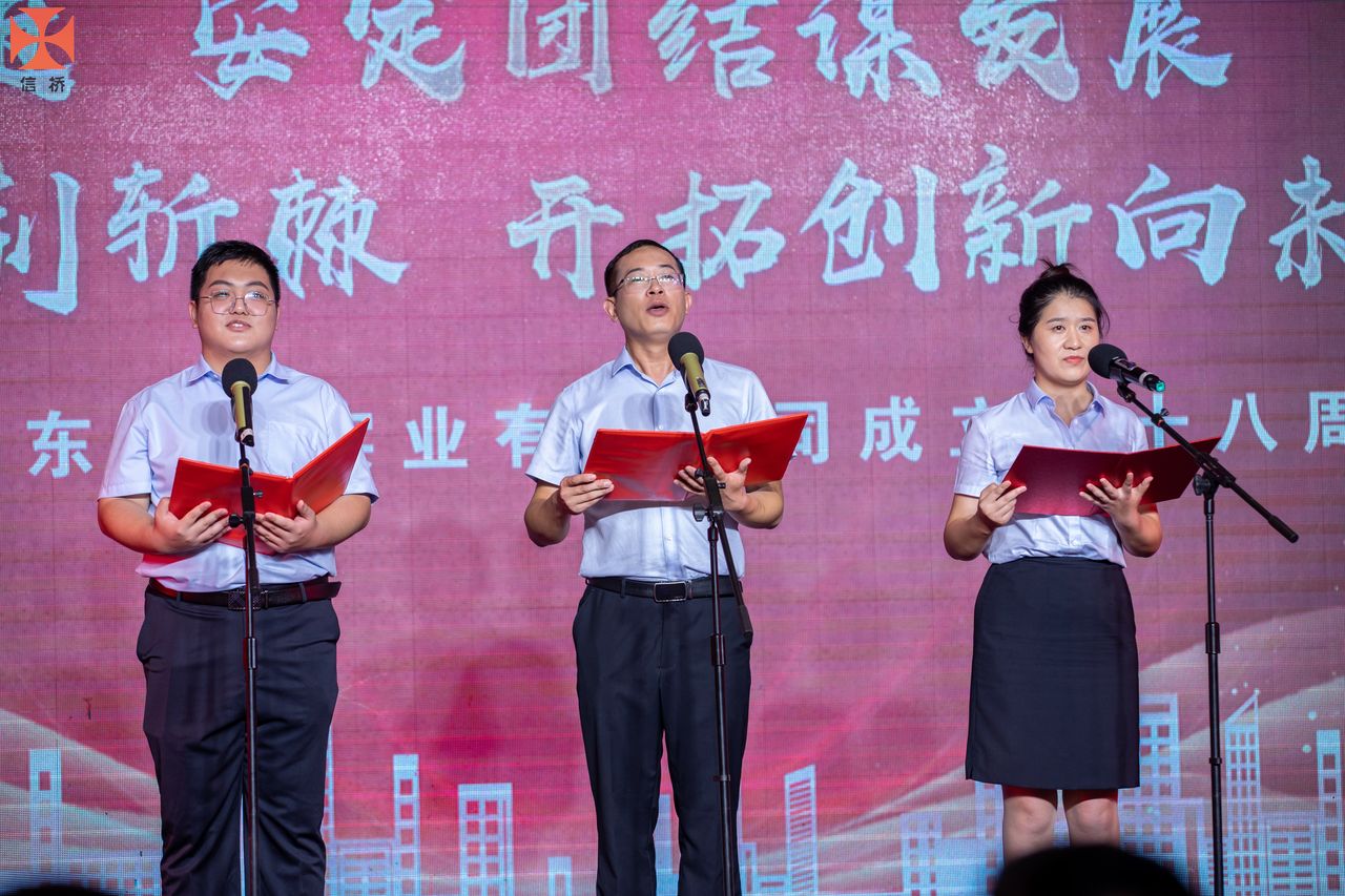 歲月如歌,風(fēng)霜如畫,二十八年彈指一揮間,山東信橋?qū)崢I(yè)有限公司(以下簡(jiǎn)稱山東信橋)迎來了二十八周歲的生日。二十八年來,信橋人在激烈的市場(chǎng)競(jìng)爭(zhēng)中奮力拼搏、砥礪前行,接受了市場(chǎng)風(fēng)風(fēng)雨雨的洗禮,取得了累累碩果。為了慶祝這一特殊的日子,2022年8月8日,以“激流勇進(jìn),安定團(tuán)結(jié)謀發(fā)展 披荊斬棘,開拓創(chuàng)新向未來”為主題的山東信橋二十八周年慶典活動(dòng)在寶盛大酒店舉行。